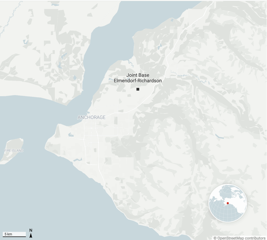 A Base Conjunta Elmendorf-Richardson é a maior base militar do estado. Com 64 mil acres, é um ponto estratégico dos EUA para exercícios militares no Ártico e para a manutenção da prontidão das tropas.